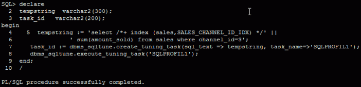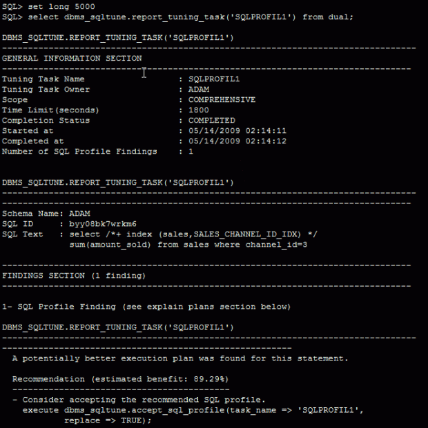 The following is the recommendation of the SQL Tuning Advisor. It recommends a SQL Profile: