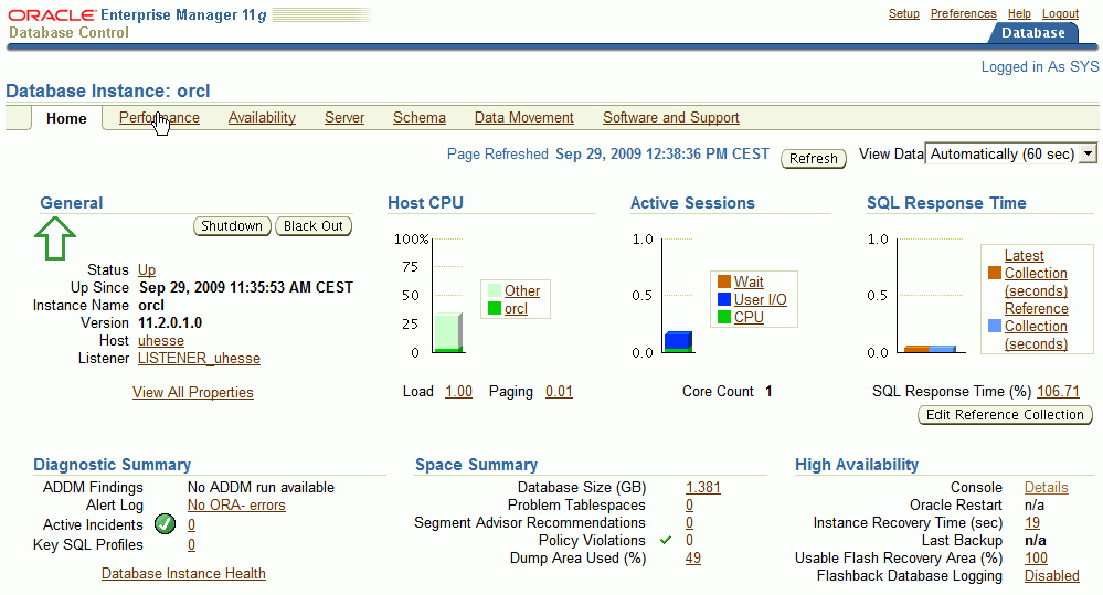 From an Oracle Instructors perspective, one major improvement of the new release is very obvious and needed: The links of Database Control are no longer in this incredible bad visible light blue! That was quite a problem, especially if you are teaching with a beamer. I will come to the other important new features of 11gR2 later on 🙂