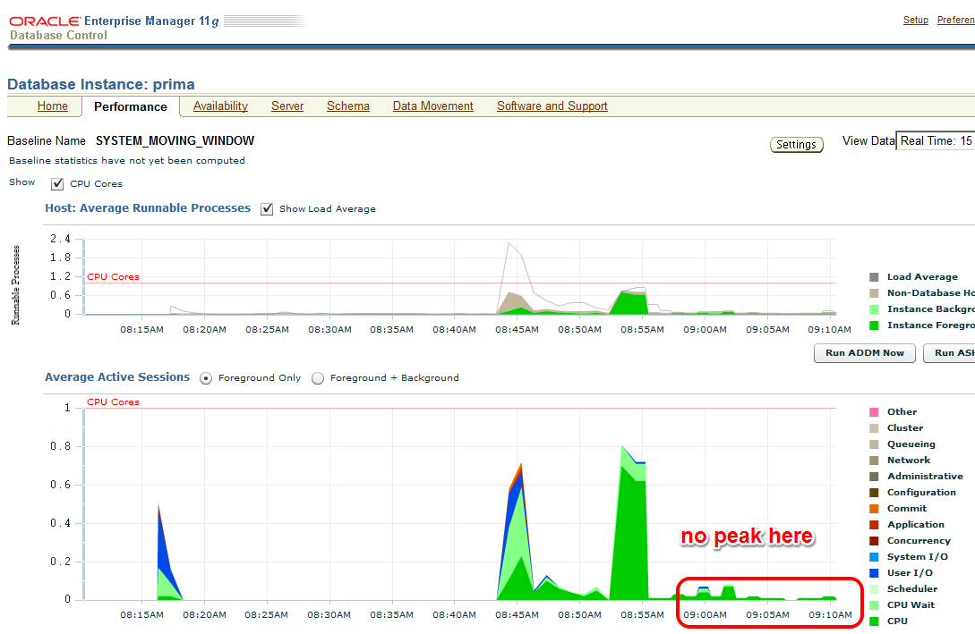 The AWR report that I take (with EM or with awrrpt.sql) as the baseline shows the following: