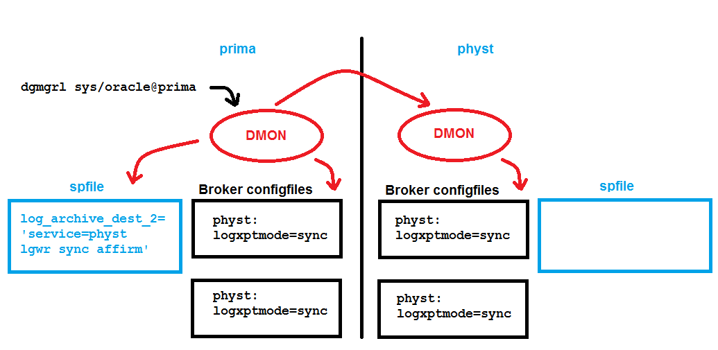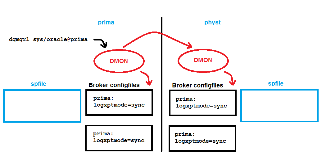 When using the Data Guard Broker, you don’t need to set any LOG_ARCHIVE_* parameter for the databases that are part of your Data Guard configuration. The broker is doing that for you. Forget about what you may have heard about VALID_FOR – you don’t need that with the broker. Actually, setting any of the LOG_ARCHIVE_* parameters with an enabled broker configuration might even confuse the broker and lead to warning or error messages. Let’s look at a typical example about the redo log transport mode. There is a broker configuration enabled with one primary database prima and one physical standby physt. The broker config files are mirrored on each site and spfiles are in use that the broker (the DMON background process, to be precise) can access: