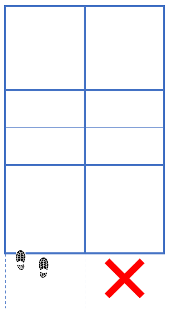 Zum Zeitpunkt, wenn der Ball beim Aufschlag auf den Schläger trifft, müssen die Füße des aufschlagenden Spielers hinter der Grundlinie und innerhalb verlängerten Linien der jeweiligen Platzhälfte sein: