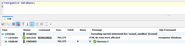 Took me about 10 Minutes on my tiny database. That command re-distributes every table across all cluster nodes and can be time consuming with high data volume. While a table is reorganized, that table is locked against DML. You can monitor the ongoing reorganization by selecting from EXA_DBA_PROFILE_RUNNING in another session.