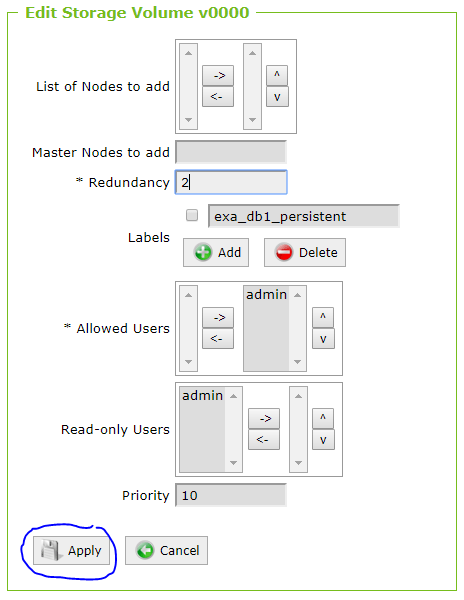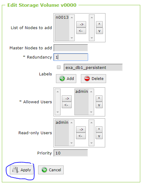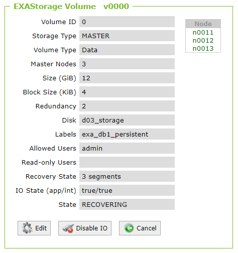 After having decreased the volume redundancy to 1, click Edit on the volume detail page again and add n13 as a new master node to the volume and click Apply: