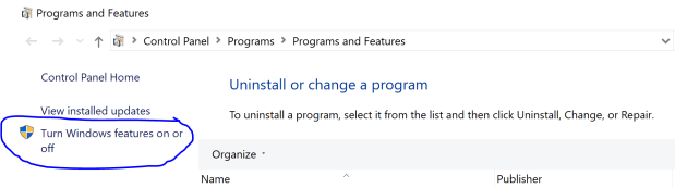 Next you go to Programms and Features and click on Turn Windows features on or off: