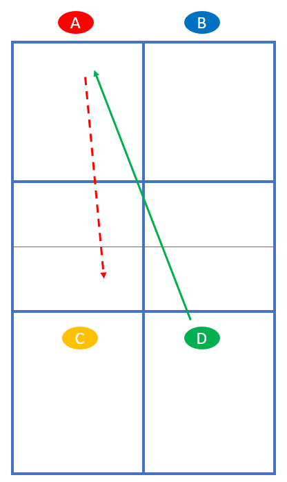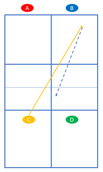 Beispiel: Spieler A beginnt mit dem Aufschlag diagonal, D dinkt (nicht zwingend) zu B und B spielt den dritten Ball in die Küche zu C. C spielt einen langen Ball in die Lücke.