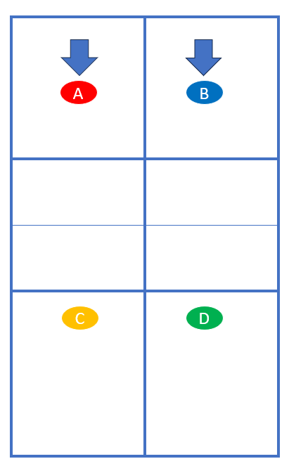 Spieler A und B sollen den Drop Shot üben. Sie stehen so, wie im normalen Spiel das aufschlagende Team vor dem 3. Schlag steht. Spieler C und D stehen so, wie im normalen Spiel das rückschlagende Team nach dem Return steht – nämlich an der NVZ. Hier in der Übung starten C und D jede Rally. Zuerst spielt D einen langen Ball diagonal. A versucht einen Drop Shot. Anschließend rücken A und B nach vorn: